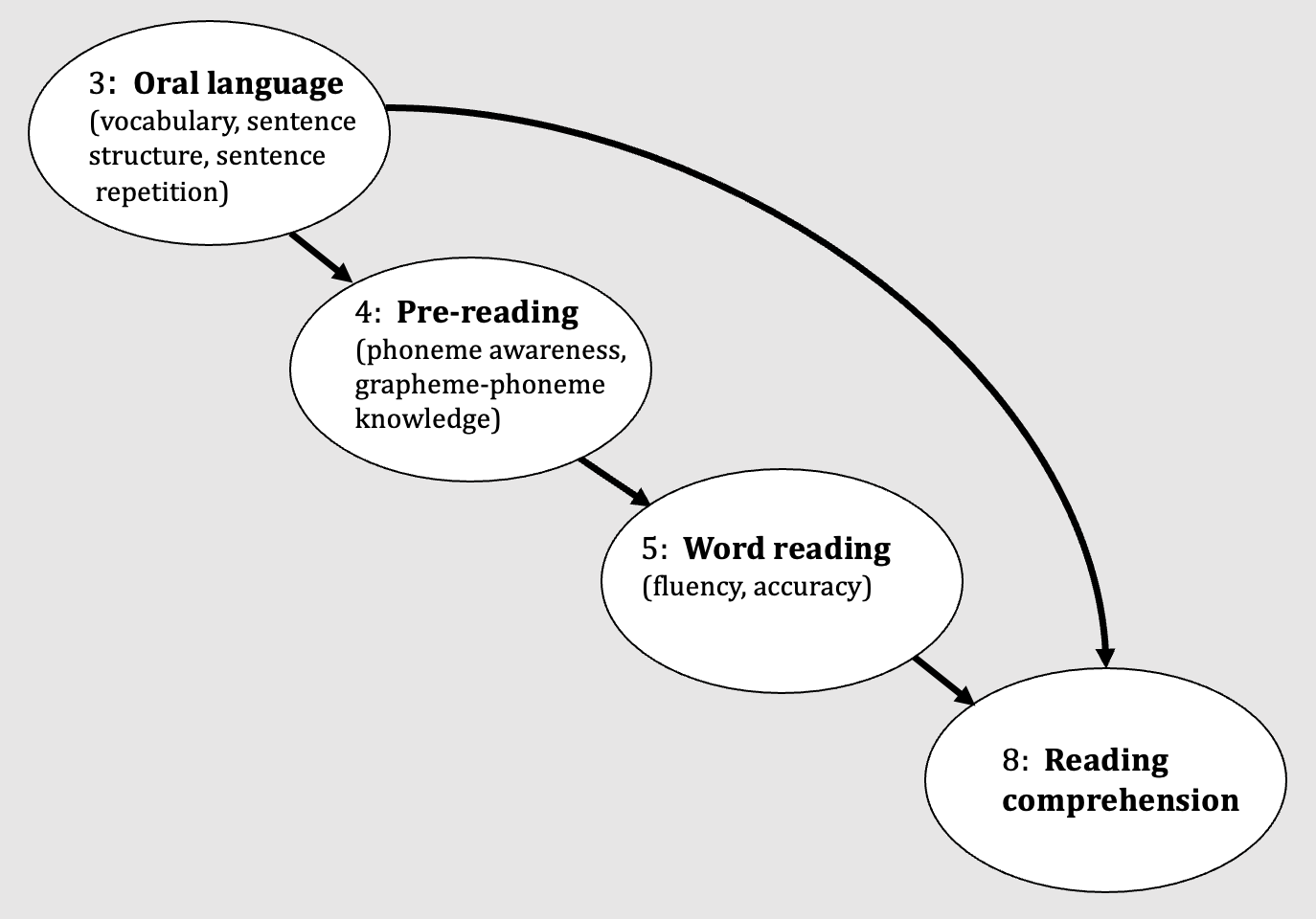 Scarborough’s pioneering study was later replicated and improved-upon by other researchers. Here’s a figure summarizing the results of a prospective, longitudinal study by Charles Hulme and colleagues (here) who followed children from age 3 to age 8. They documented a developmental cascade of effects: oral language differences at age 3 leading to subsequent differences in reading development, including reading comprehension at age 8. These studies are discussed on pp.168-170 of my book.